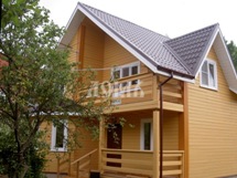 Интересный внешний вид: лаконичность и строгость линий, классическая крыша, терраса и оригинальная лоджия над ней. Надежное основание: ленточный фундамент и цоколь из бетонных блоков. Теплые и «дышащие» стены из самого ценного природного материала - бруса. Практичная и долговечная кровля, выполненная из металлочерепицы с обязательной тепло- и гидроизоляцией.